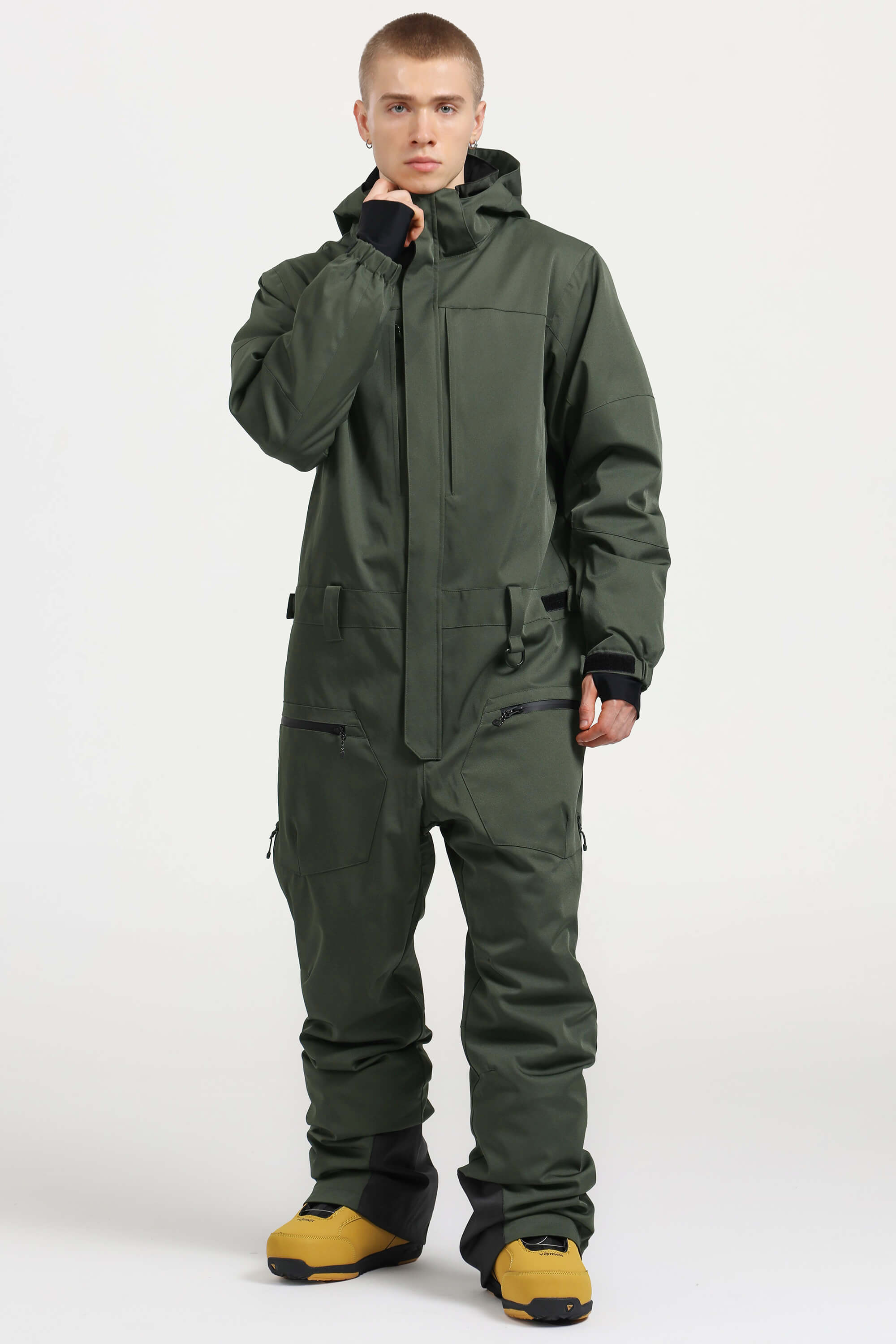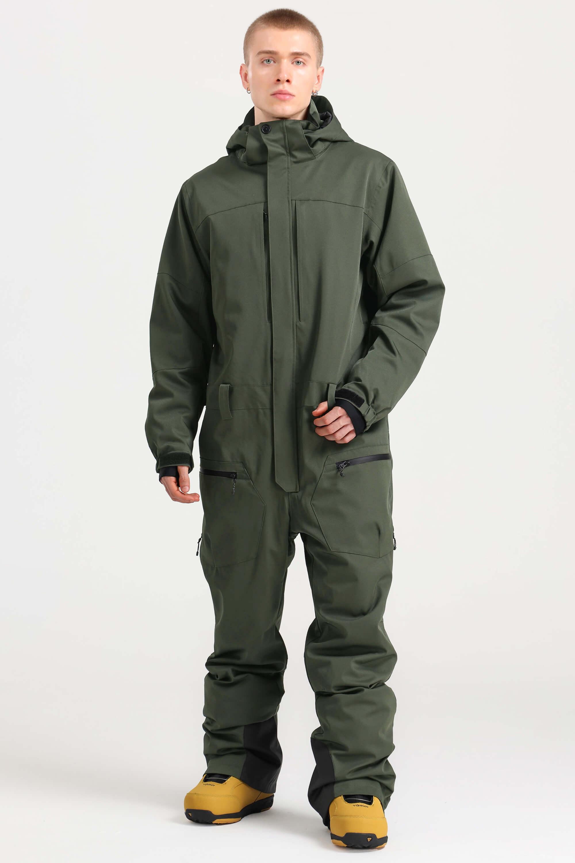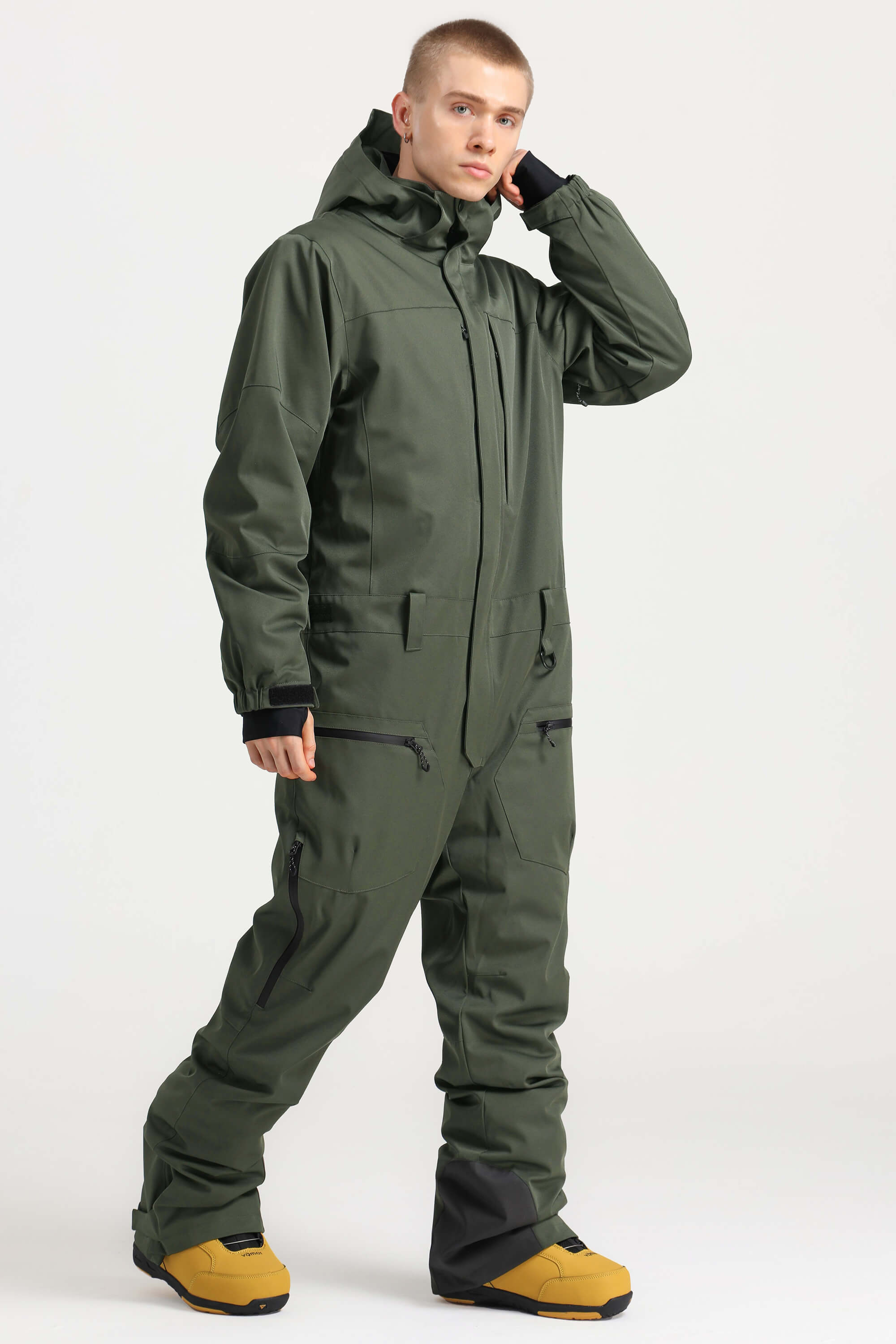 Men's Army Green Stylish Waterproof & Windproof Loose-Fit One-Piece Ski Suit With Detachable Hood & Multipockets Snowboard Suit - Gsou Snow