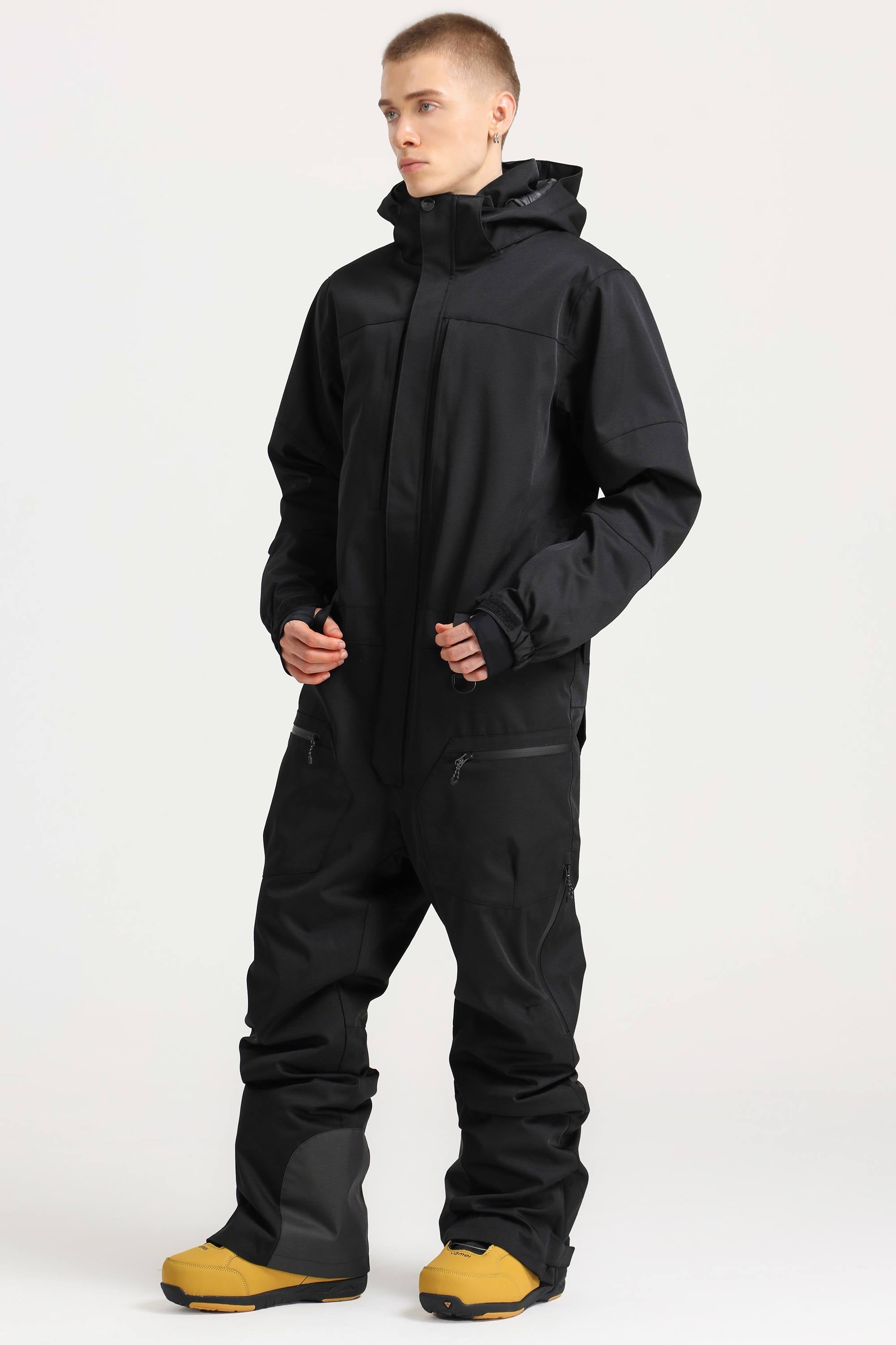 Men's Black Stylish Waterproof & Windproof Loose-Fit One-Piece Ski Suit With Detachable Hood & Multipockets Snowboard Suit - Gsou Snow