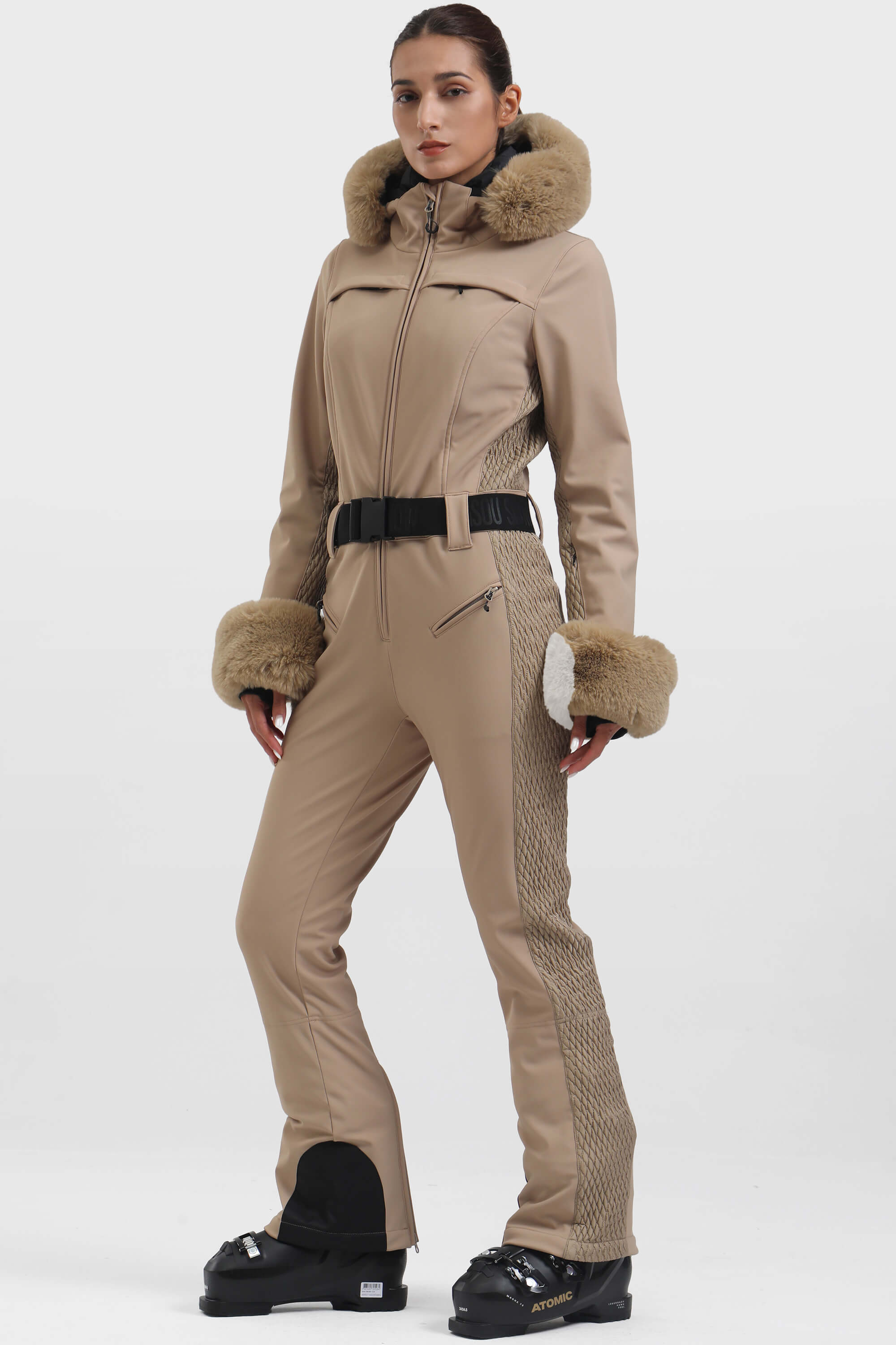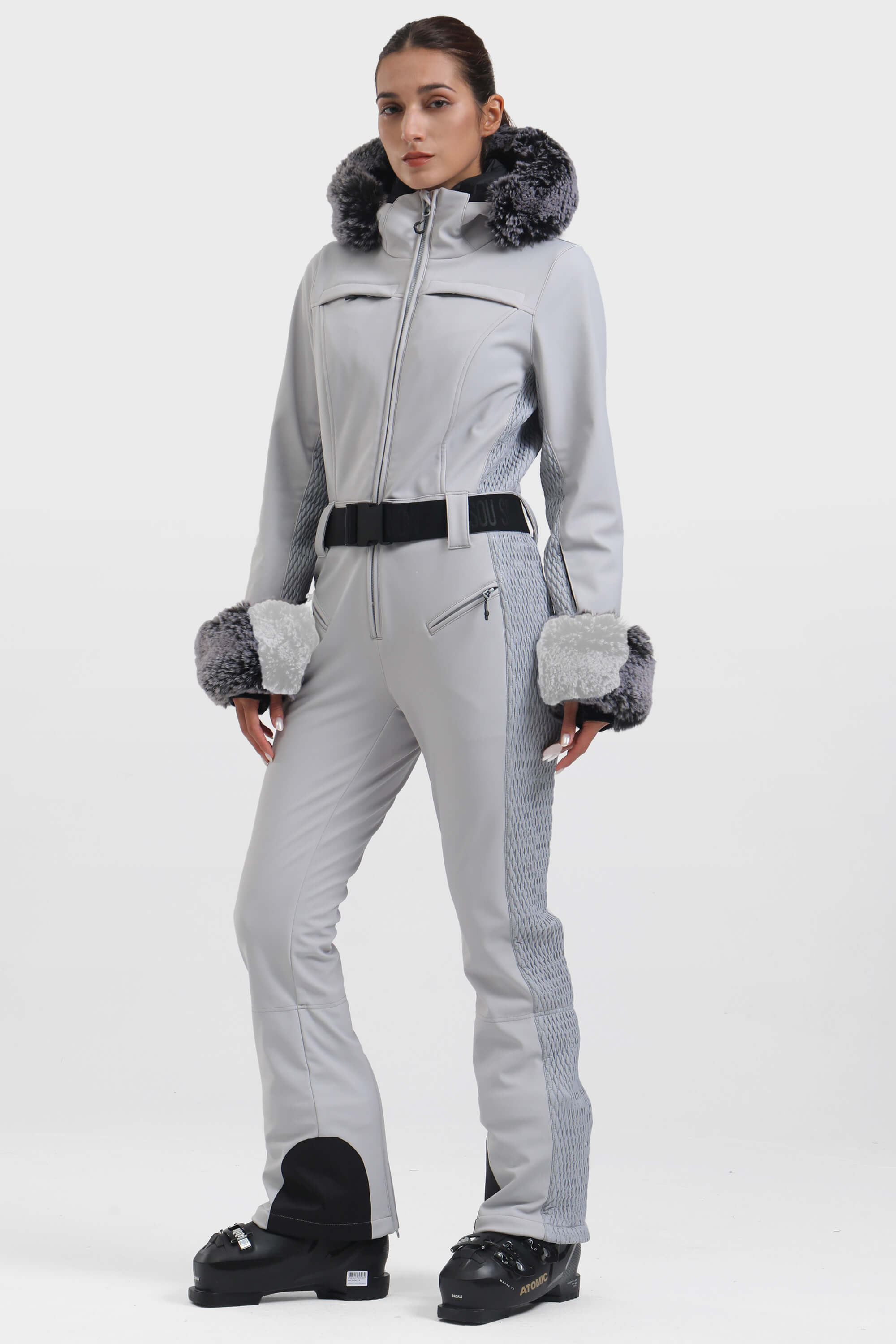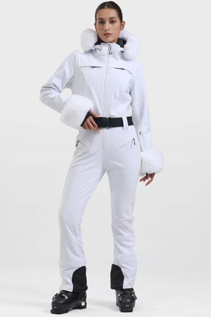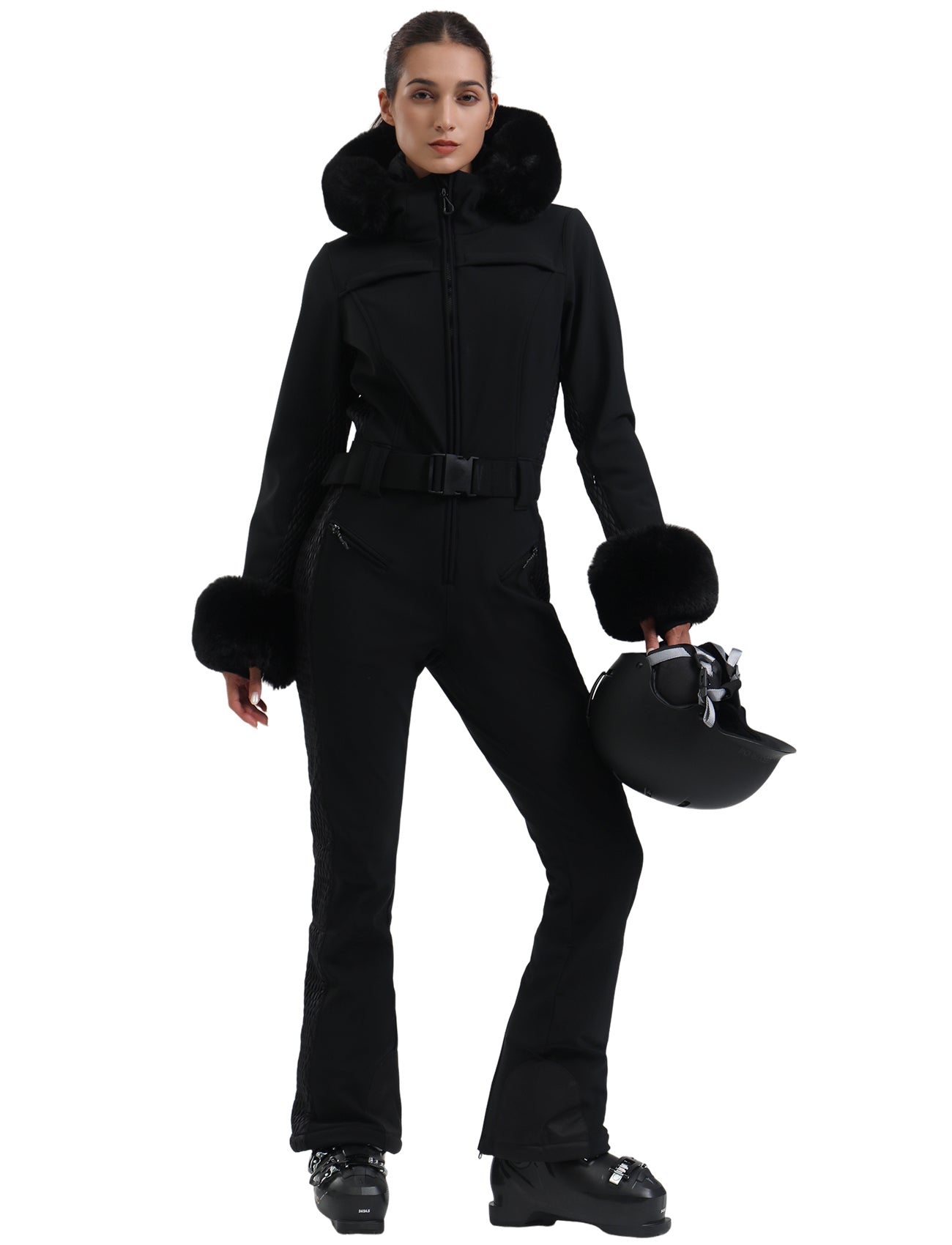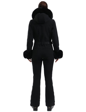Women's Black Faux Fur Shirred Waterproof Ski Suit One-Piece Snowboard Suit - Gsou Snow
