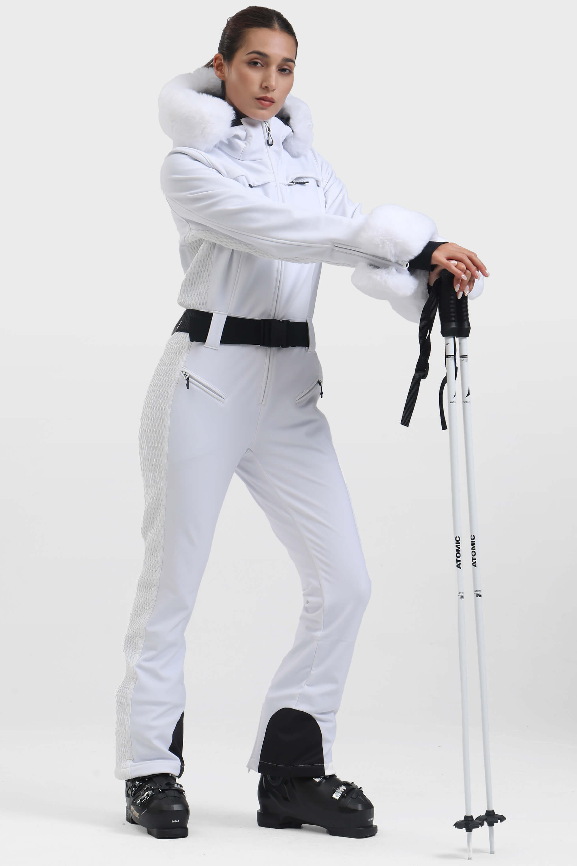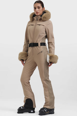Women's Pink Faux Fur Shirred Waterproof Ski Suit One-Piece Snowboard Suit - Gsou Snow